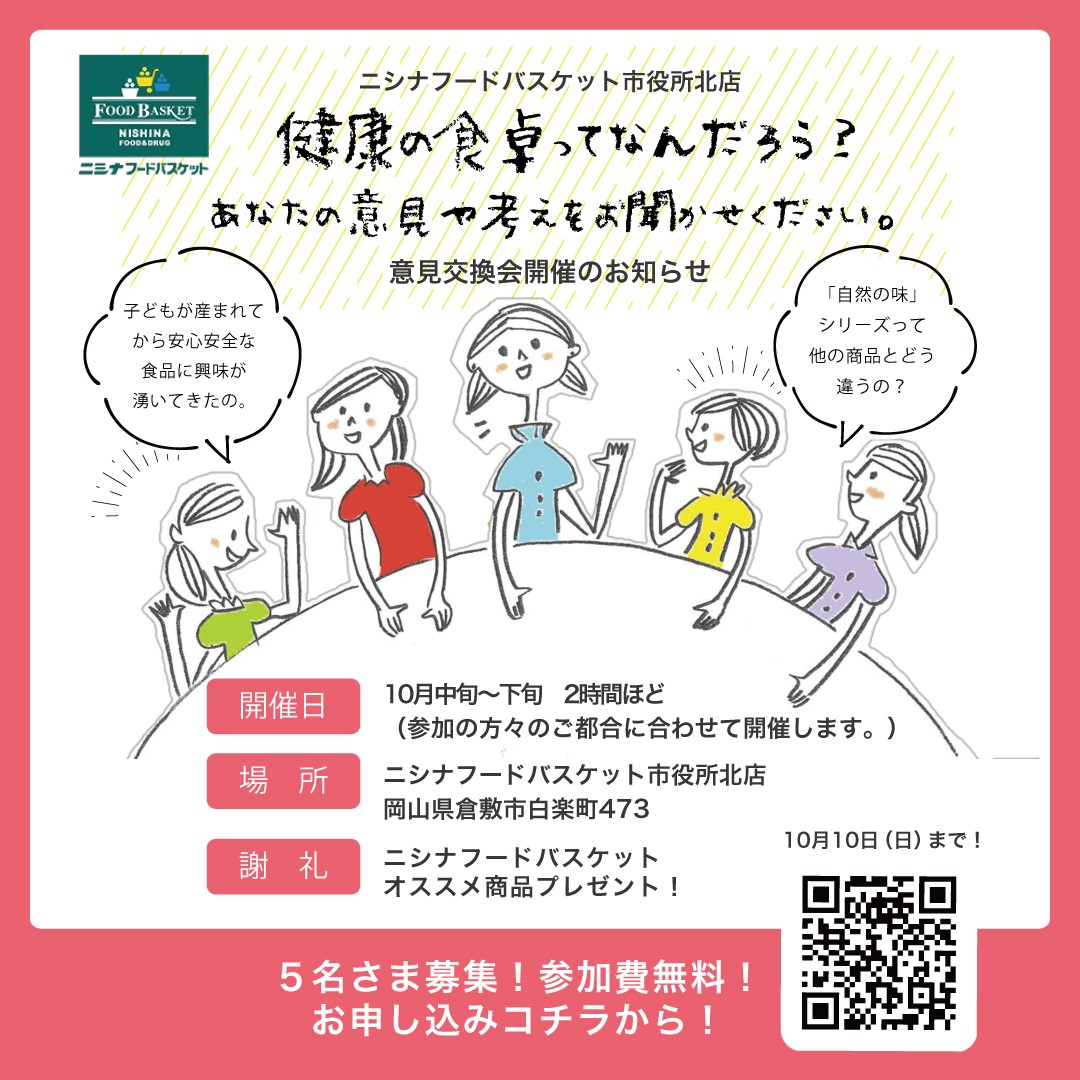 弊社では、倉敷・岡山を中心に展開するスーパーマーケット「ニシナフードバスケット」様よりご依頼をいただき、コンセプトの1つである「健康の食卓」についてのブランディングサポートを行っております。