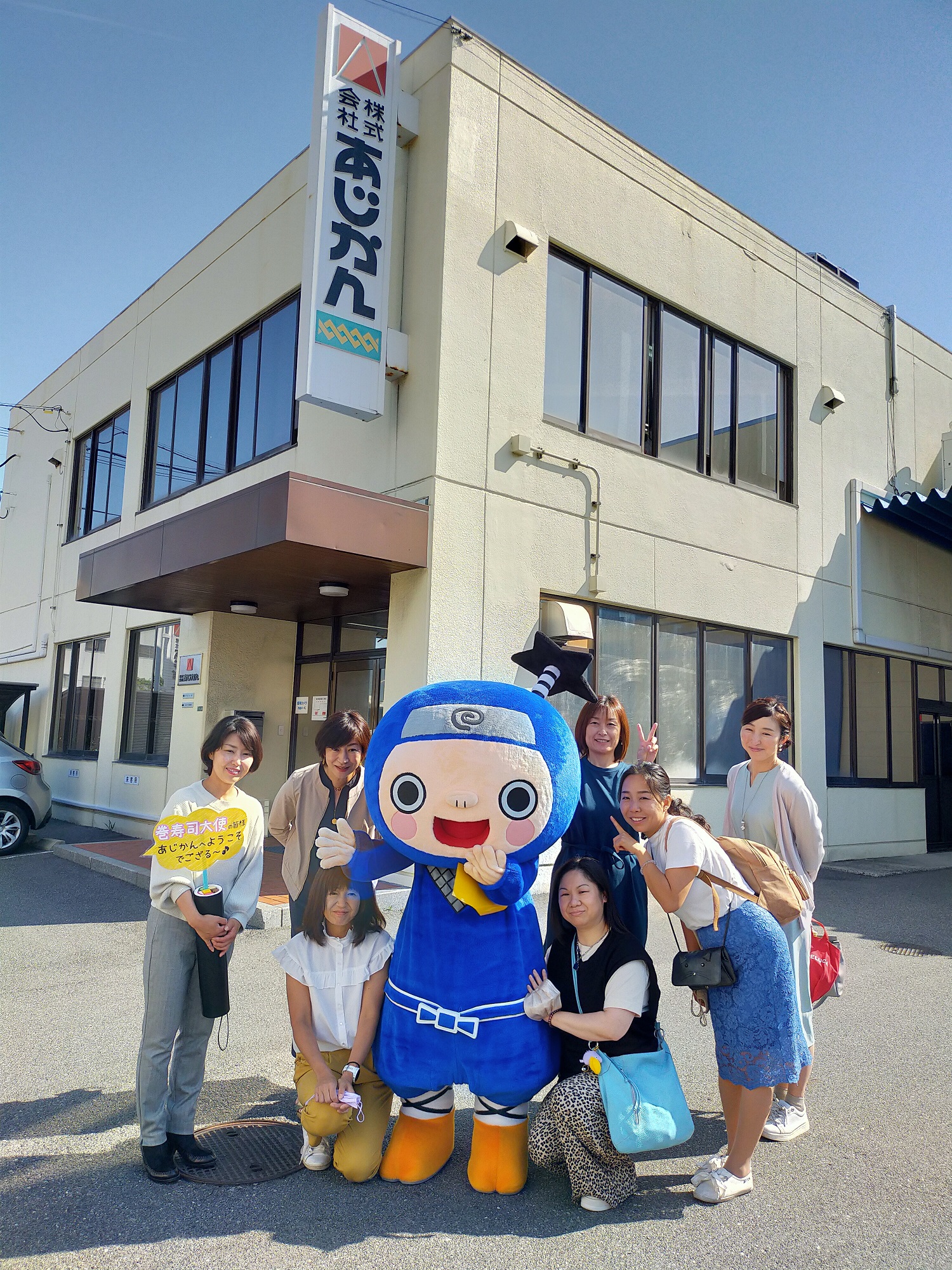 あじかん社屋に到着すると、あじかんキャラクター「巻之助君」がお出迎えしてくれました。