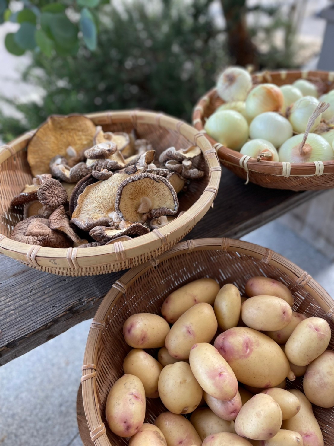 6月23日 わ食の日、1週間前になりました。なぎさ公園小学校の敷地内の畑で収穫された、じゃがいも、玉ねぎ、そして乾燥椎茸がデリキッチンに届けていただきました。