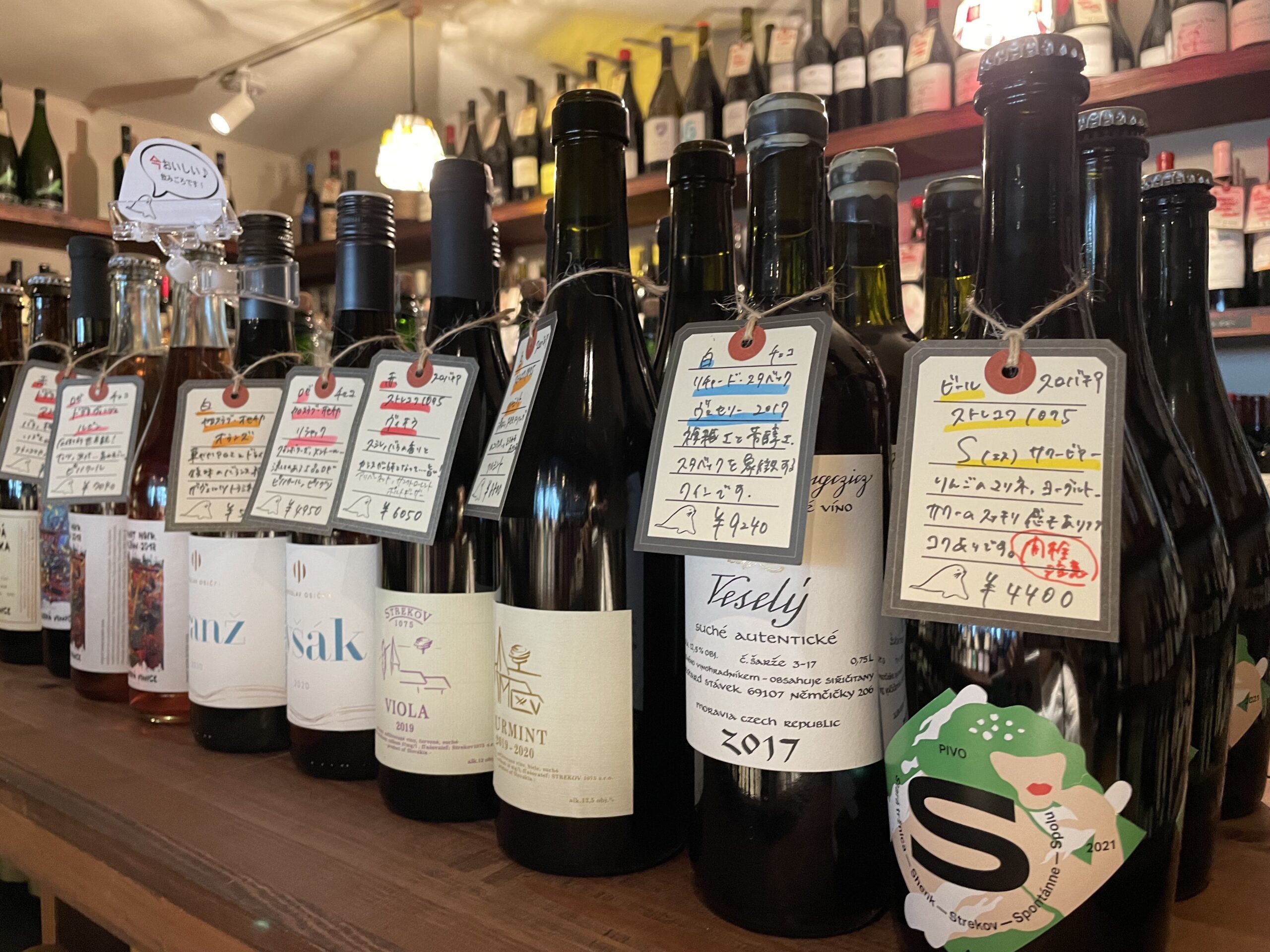 お酒を愛するスタッフが現地に足を運んで集めたというワインセラーにならぶワインのラインナップにはおすすめポイントを紹介するコメントP O Pが丁寧にかかれ、ひとつひとつみているだけでワクワクします。