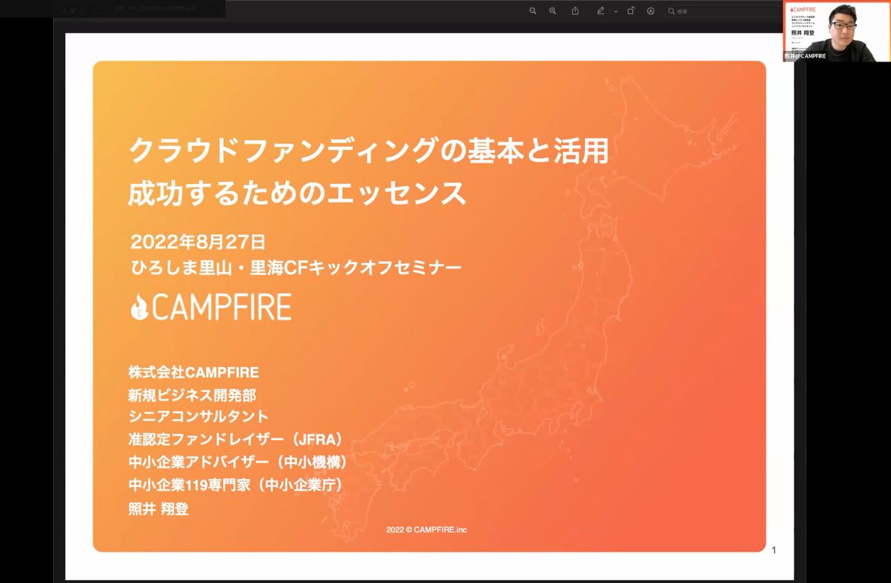 自己紹介の後、株式会社CAMPFIRE 新規ビジネス開発部 シニアコンサルタント 照井翔登氏による講義「クラウドファンディングの基本と活用 成功するためのエッセンス」を、視聴しました。