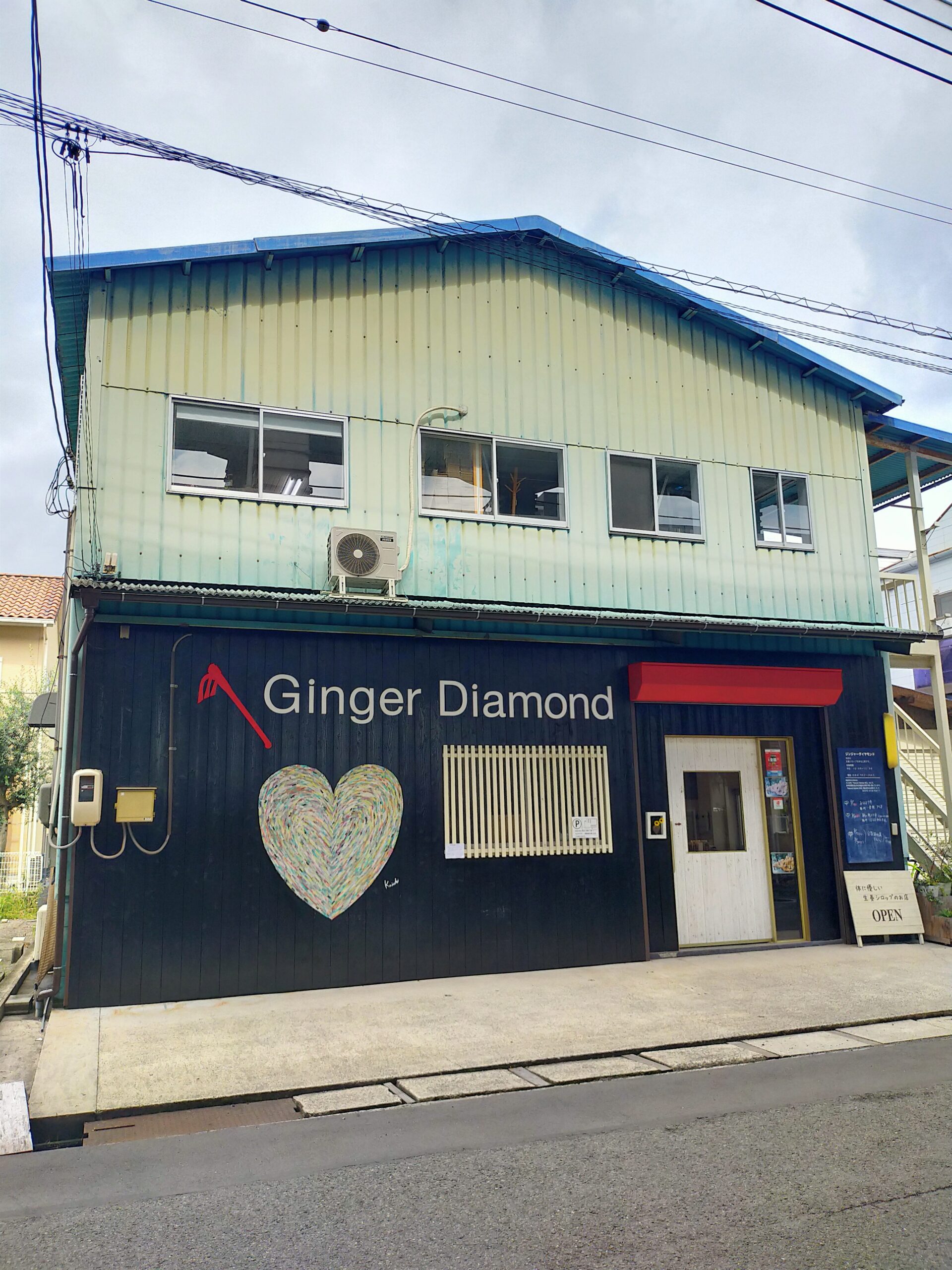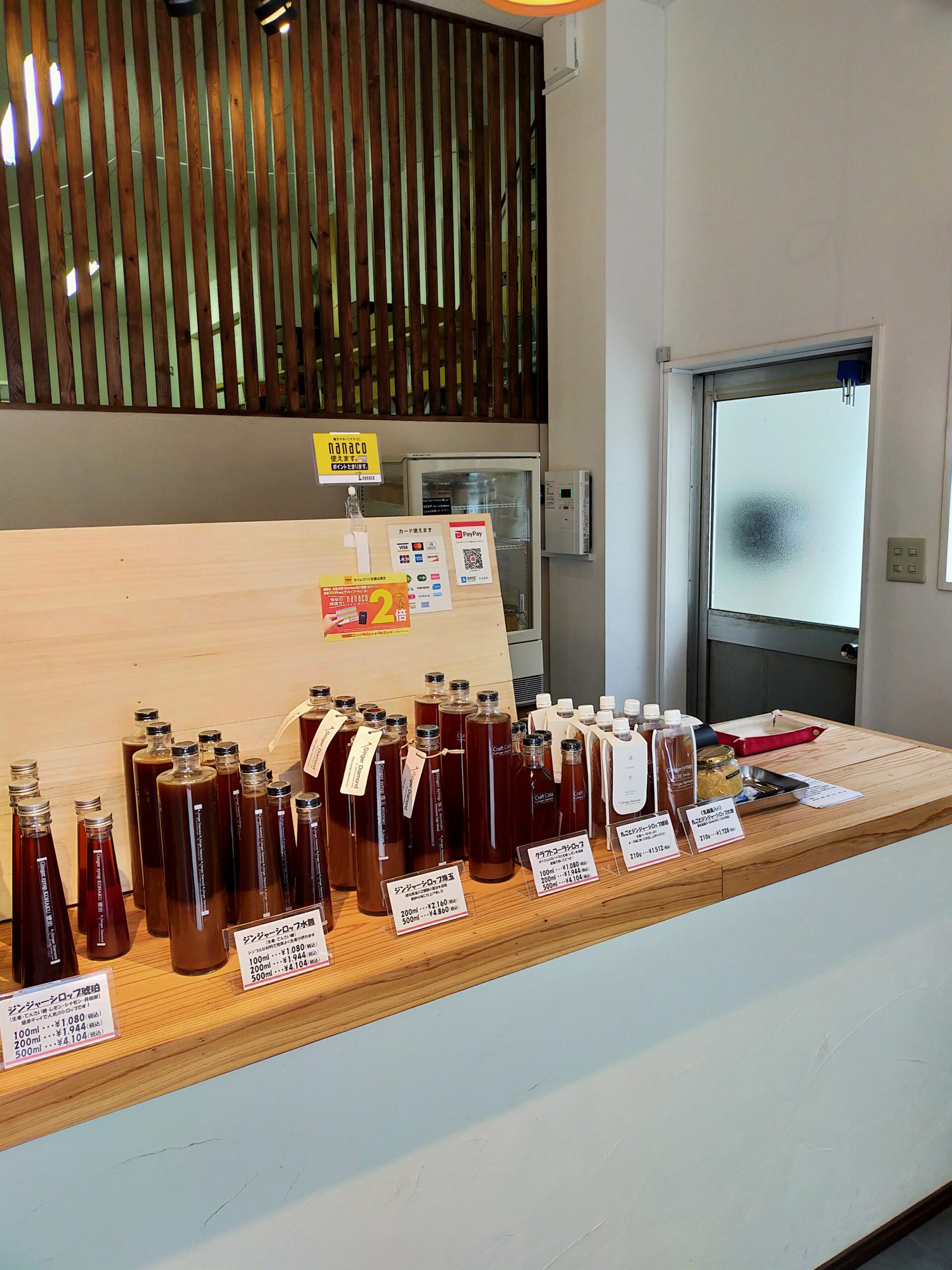 ジンジャーダイヤモンドさんは、福山駅から西に徒歩約10分ほどにある、加工工場と店舗が併設されたお店です。扉を開くと、バラエティ豊かなジンジャーシロップや、クラフトコーラーシロップ、生姜のジャム、生姜ごはんの素がカウンターに並び、奥は加工場として作業されている様子がガラス越しに見えます。