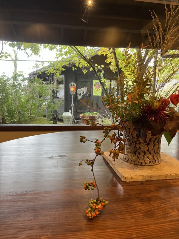 瓢箪堂さんのカフェスペースの大きな窓からは雨上がりの庭が綺麗に見えて素敵な景色が
