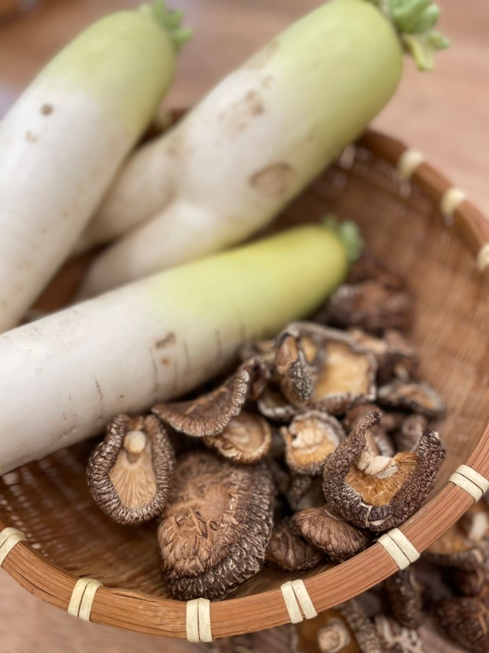 トマトはミートボールソースに、大根、しいたけは煮つけに。