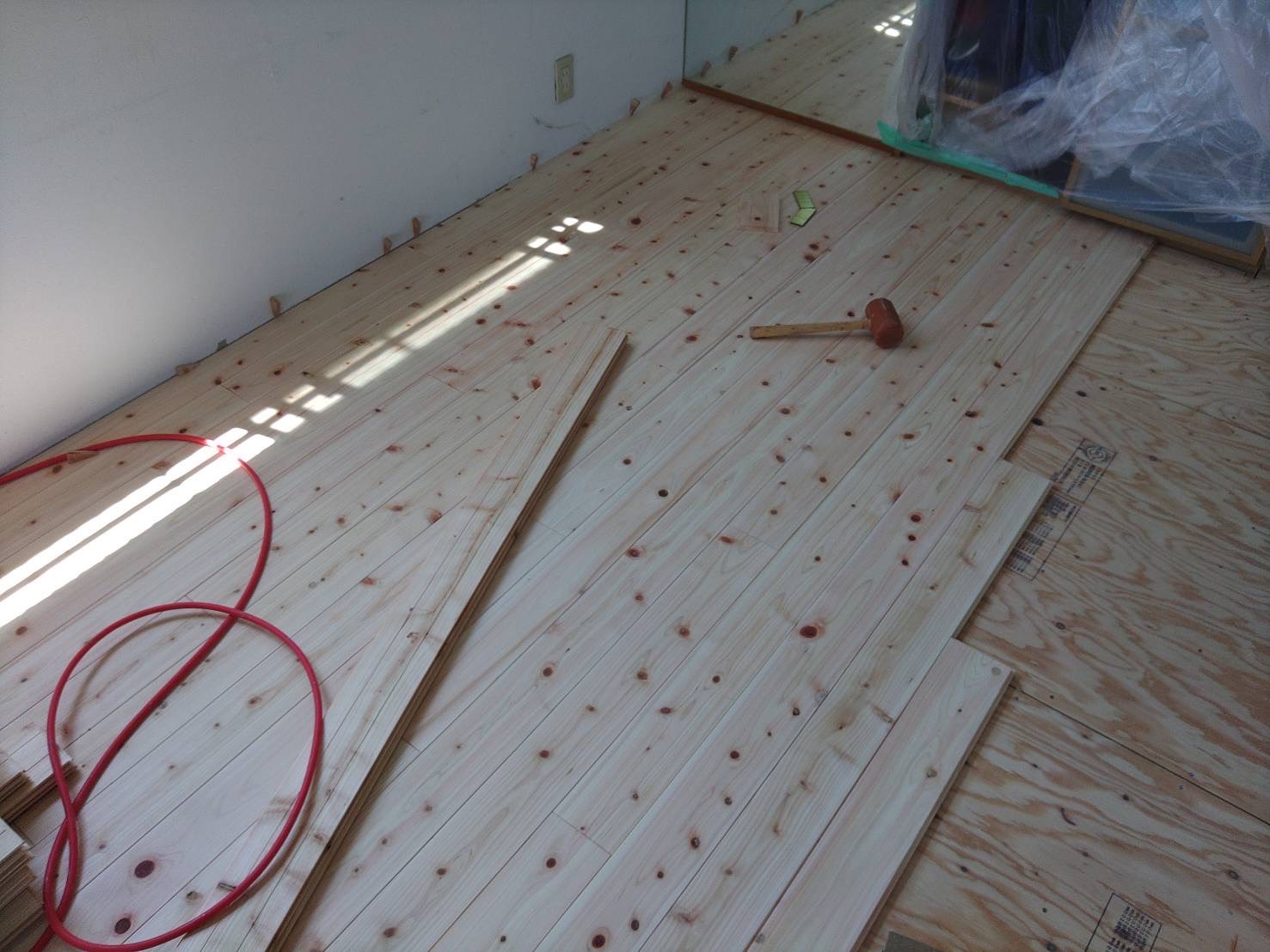 さて床はこんな感じ。今は白い床に見えますがここから少し茶系にしていただけるオイル塗りをお願いしています。