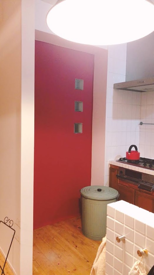 「黄」や「緑」など色を入れてインパクトを与えてはどう?の提案のもとにキッチン部分を命の源を意味するオレンジに近い「赤」にしてみることに。お願いしたラーバンの設計士さんがお休みの時にペンキ塗りを買って出てくれて(ありがたい)これはとても良い提案でした。