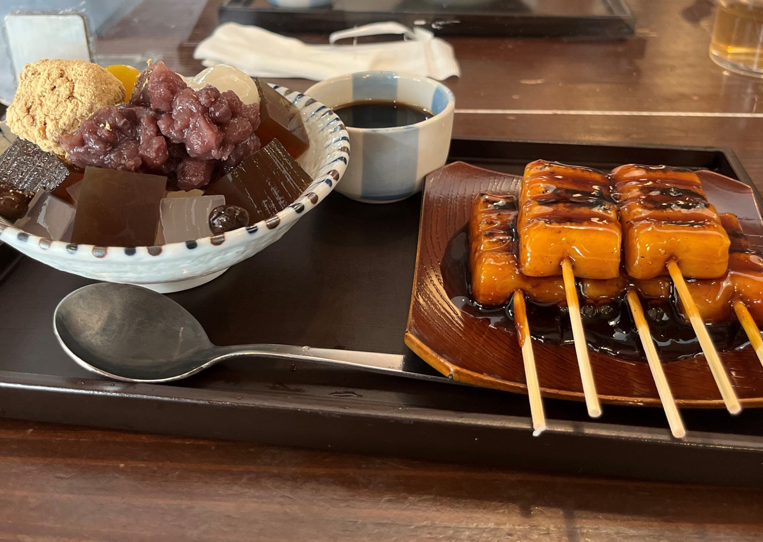甘味もおいしい京都。黒蜜あんみつとお団子セットを。このみたらしだんごはペロッと頂ける絶品でした。広島の丸いお団子と違い角のおだんご、時代劇みたいで面白い。