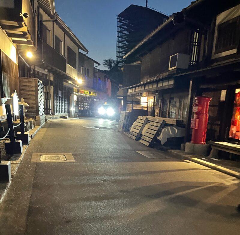 夕暮れに歩く宮島、町家どおりは行燈の灯りがとてもきれいでした。