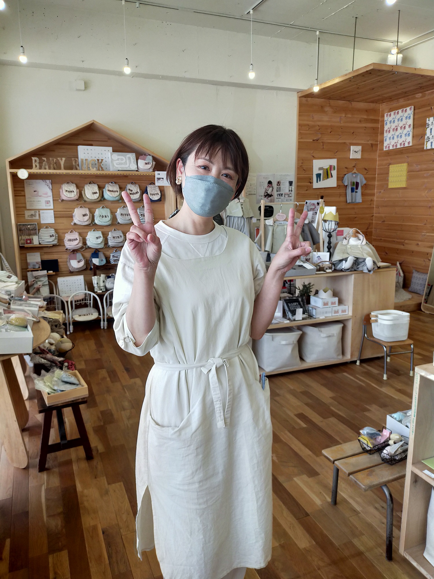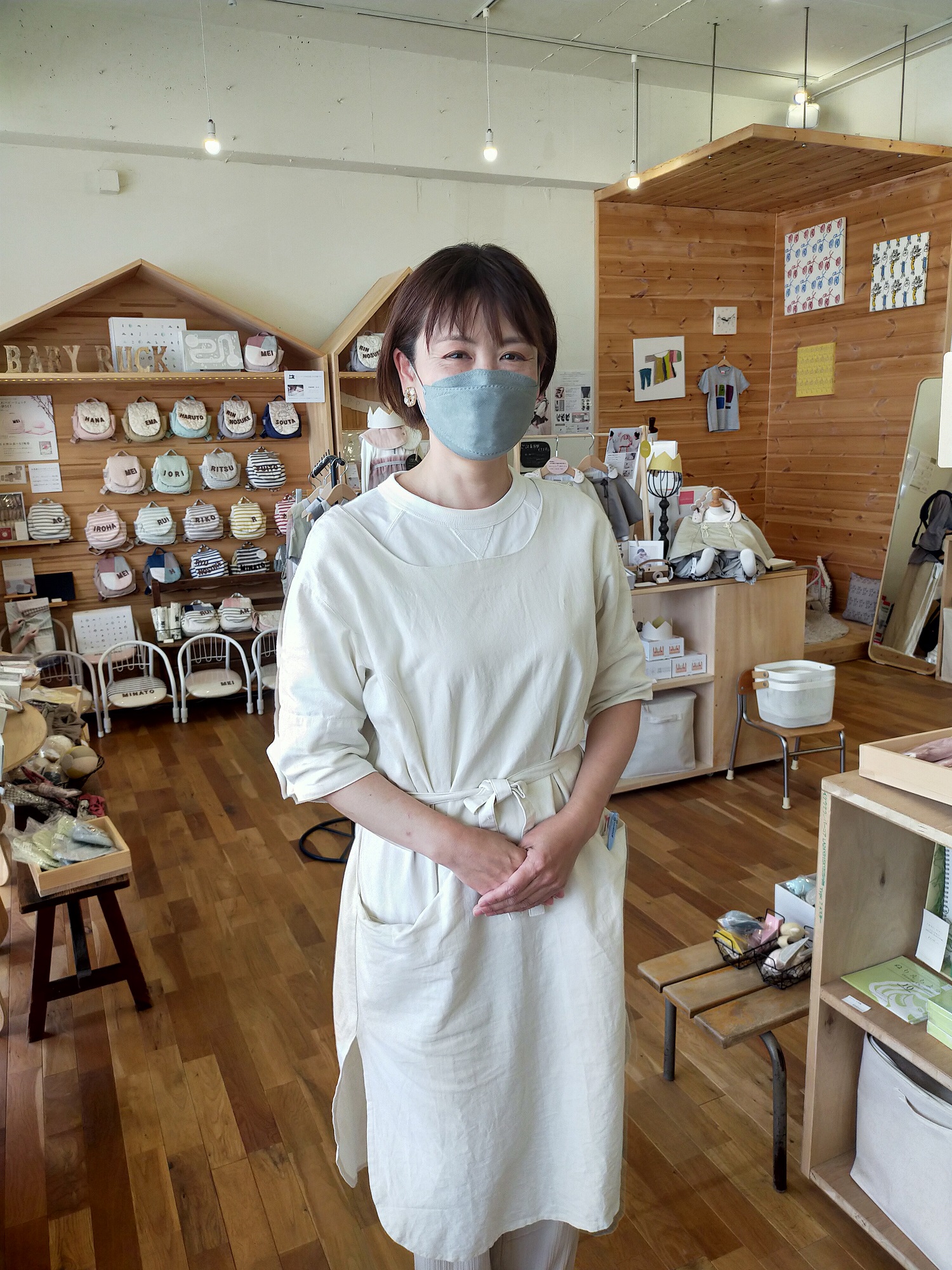 1階のリシュマム店舗のスタッフは、リネンのお揃いのエプロンに、幅広パンツスタイルという