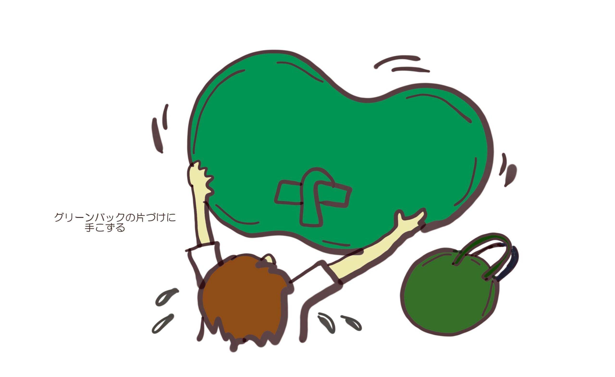 下図 グリーンバックを袋から出し入れするのに、手こずり、ディスプレイのお酢の瓶を破壊したエピソード。ありませんか?こういうこと。