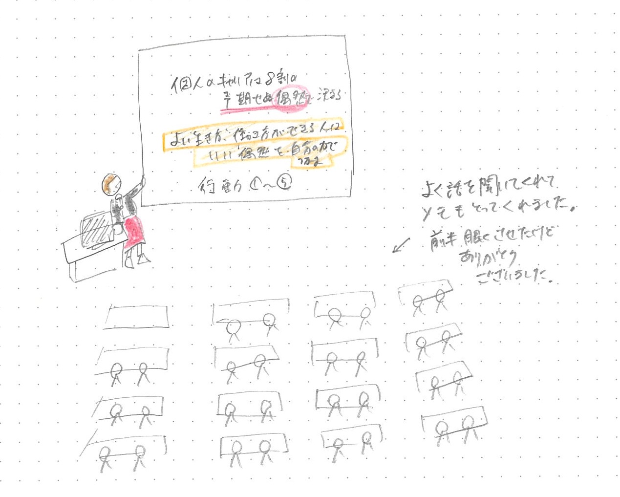 「人生は予期せぬ偶然で決まる。そのために、日ごろからいい偶然をつかむために、たのしいことを考える練習をする」を、資料にはりつけてお伝えしました。